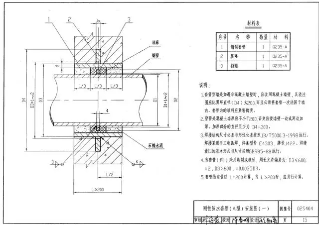 穿線密閉套管說(shuō)明:1、當(dāng)迎水面為腐蝕性介質(zhì)時(shí),可采用封堵材料將縫隙封堵;2.套管穿墻處如遇非混凝土墻壁時(shí),應(yīng)局部改用混凝土墻壁,其澆注范圍應(yīng)比翼環(huán)直徑(DS)大200,并且必須將套管一次澆固…